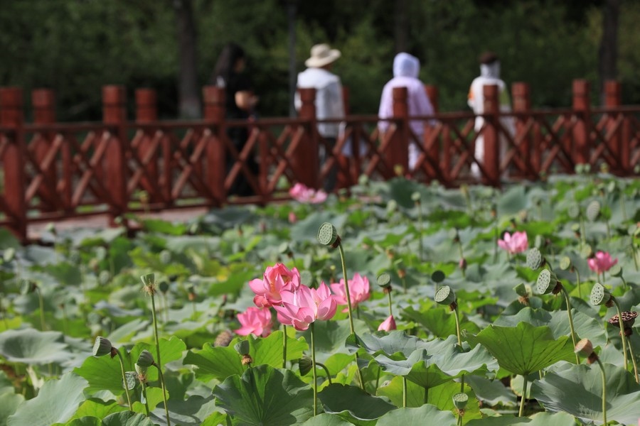 8月10日,內(nèi)蒙古烏海人民公園內(nèi)的荷花正盛放。游客在此賞荷。