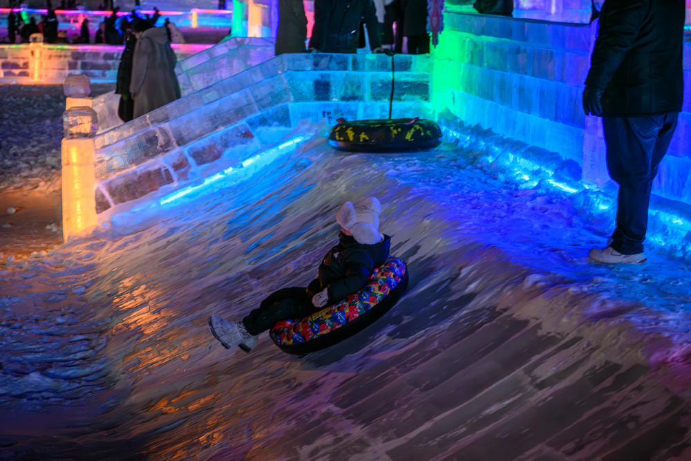 園區(qū)內(nèi)更是熱鬧非凡。中式“北國(guó)第一門(mén)”、俄式童話城堡、蒙式游牧風(fēng)情三大特色入口,成了游客打卡的首選地。258米長(zhǎng)的中式主題雪墻鋪展著“萬(wàn)里茶道”的傳奇故事,復(fù)古火車(chē)站、蒸汽機(jī)車(chē)雪雕復(fù)刻著中東鐵路的舊時(shí)光,隨手一拍都是自帶氛圍感的大片。冰雪滑梯、雪地碰碰球等十余項(xiàng)娛樂(lè)項(xiàng)目前排起了長(zhǎng)隊(duì),大人小孩都玩得不亦樂(lè)乎;蒙古包暖屋里,熱氣騰騰的奶茶、鮮燉烤梨香氣四溢,暖心又暖胃??萍几欣瓭M了游玩體驗(yàn),不少游客拿著手機(jī)掃碼體驗(yàn)語(yǔ)言冰書(shū)冰墻,中俄蒙常用語(yǔ)一學(xué)就會(huì),還有炫彩音樂(lè)噴泉冰柱打造互動(dòng)琴鍵裝置,時(shí)光之門(mén)光幕呈現(xiàn)科幻特效。