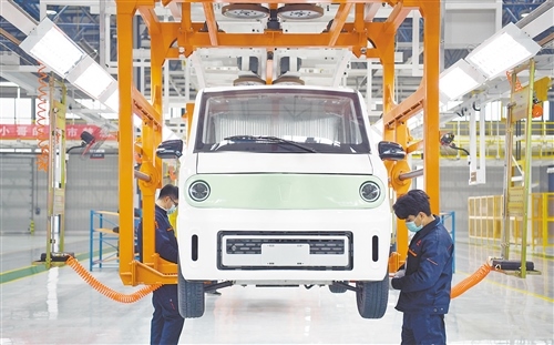 12月12日,工人在總裝車間組裝新能源快遞車。當(dāng)日,由山東豪馳智能汽車有限公司投資、中建電力建設(shè)有限公司承建的智能新能源商用車制造基地在山東濟(jì)南市萊蕪區(qū)投產(chǎn)。新華社記者 金良快攝