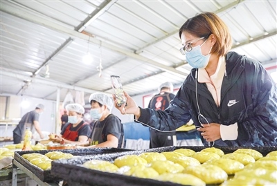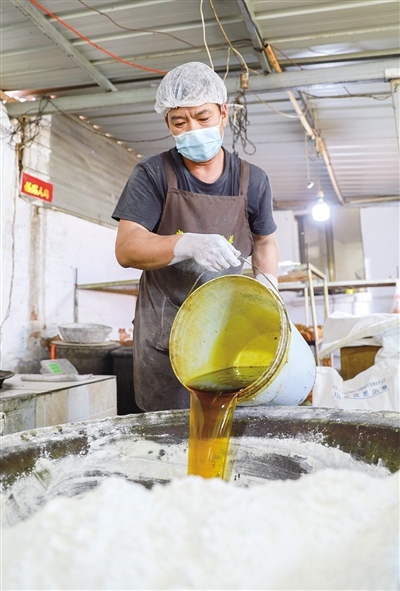 “我們堅(jiān)持手工制作,就是想留住這個(gè)味道!”常三文是隆盛莊月餅制作技藝非遺傳承人,他帶記者來(lái)到了打月餅的作坊。一個(gè)約60平方米的房間里有兩個(gè)大鐵鍋,一個(gè)鐵鍋里熬著糖水,另一個(gè)鐵鍋用來(lái)和面。一名男工將面粉、熟胡麻油、糖水等按比例倒入鐵鍋,然后用鐵鏟攪拌起來(lái)。鐵鍋旁邊是一個(gè)做月餅的大案板,4個(gè)女工稱重、分劑、做胚、擺放,各自忙活著。常三文的兒子常曉峰負(fù)責(zé)將擺放好的月餅放進(jìn)燒爐火的烤爐,計(jì)時(shí)、下簽子、刷油……直至月餅烤制完成出爐。