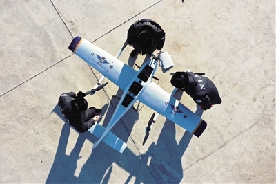 測量、加油、調(diào)試、升空……隨著螺旋槳高速轉(zhuǎn)動,一架 “鷹眼”固定翼無人機騰空而起,劃破北疆寂靜的天空,以每小時110公里的速度沿著邊管區(qū)巡航。