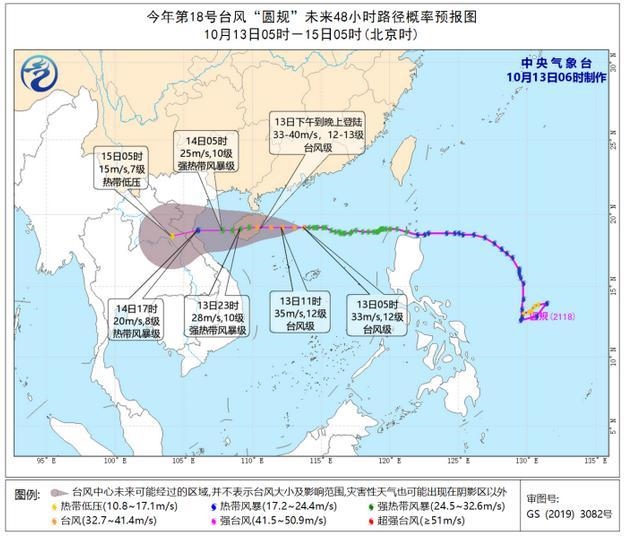 預(yù)計(jì),“圓規(guī)”將以每小時(shí)25-30公里的速度向偏西方向移動(dòng),強(qiáng)度還將有所加強(qiáng),將于13日下午到晚上在海南文昌到陵水一帶沿海登陸,登陸強(qiáng)度為臺(tái)風(fēng)級(jí)(12-13級(jí),33-40米/秒)。登陸后,強(qiáng)度逐漸減弱,穿過海南島,14日凌晨移入北部灣,然后趨向越南北部。
