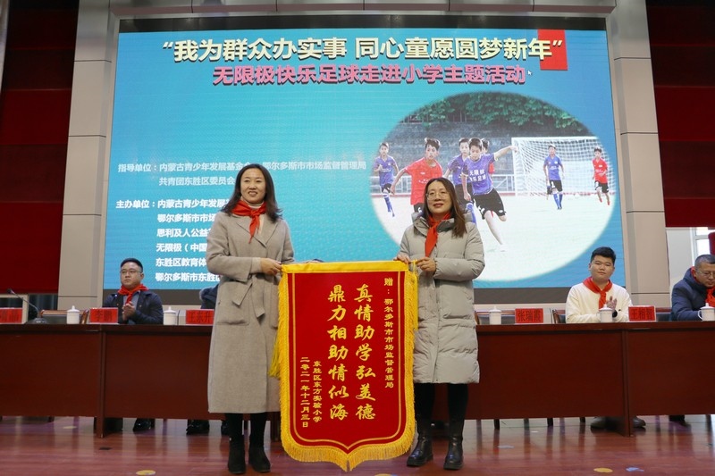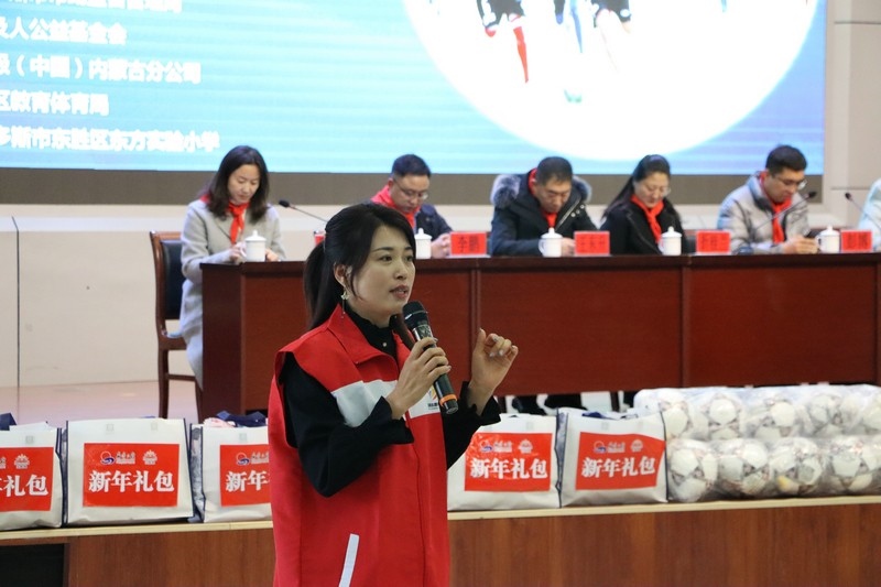 鄂爾多斯市市場監(jiān)督管理局副局長折桂蘭在公益活動上致辭,希望同學們不要單一地關(guān)注學習,而要德、智、體、美全面發(fā)展,提升綜合能力,同時用優(yōu)異的成績來回報每一個愛心人士的無私奉獻與幫助。也希望同學們分配好時間,能夠熱愛足球,熱愛自已感興趣的運動、愛好,這會讓生活更加多姿多彩,也希望同學們今后能多方面為國家貢獻自己的力量,成為各行業(yè)里的優(yōu)秀人才。