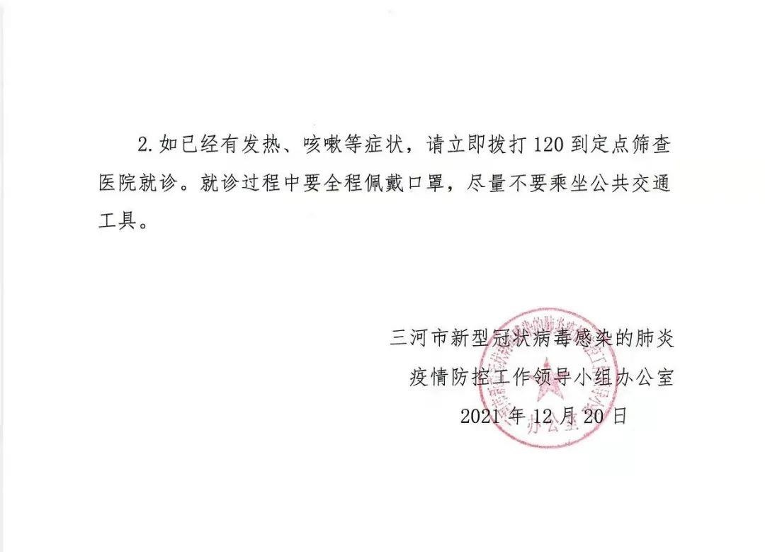 中新網(wǎng)12月20日電 據(jù)河北三河市網(wǎng)信辦官方微信消息,三河市新冠肺炎疫情防控工作領(lǐng)導(dǎo)小組辦公室今日發(fā)布公告,通報1例北京確診病例密接者行動軌跡。