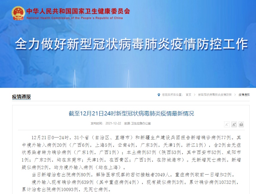 12月21日0—24時,31個省(自治區(qū)、直轄市)和新疆生產建設兵團報告新增確診病例77例。其中境外輸入病例20例(廣西6例,上海5例,云南4例,廣東3例,天津1例,浙江1例),含2例由無癥狀感染者轉為確診病例(廣東1例,廣西1例);本土病例57例(陜西53例,其中西安市52例、咸陽市1例;廣東2例,均在東莞市;天津1例,在西青區(qū);廣西1例,在防城港市)。無新增死亡病例。新增疑似病例2例,均為境外輸入病例(均在上海)。