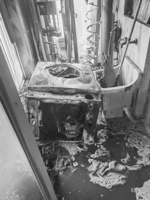 經(jīng)了解,起火點位于業(yè)主家的北陽臺,業(yè)主將吹風(fēng)機開機對著陽臺水管吹了整整一夜,該吹風(fēng)機發(fā)生故障著火后引燃了堆積的雜物,洗衣機被燒得只剩下骨架,玻璃窗戶受熱后完全破碎,雜物悉數(shù)被燒,水管、墻面也被熏黑。
