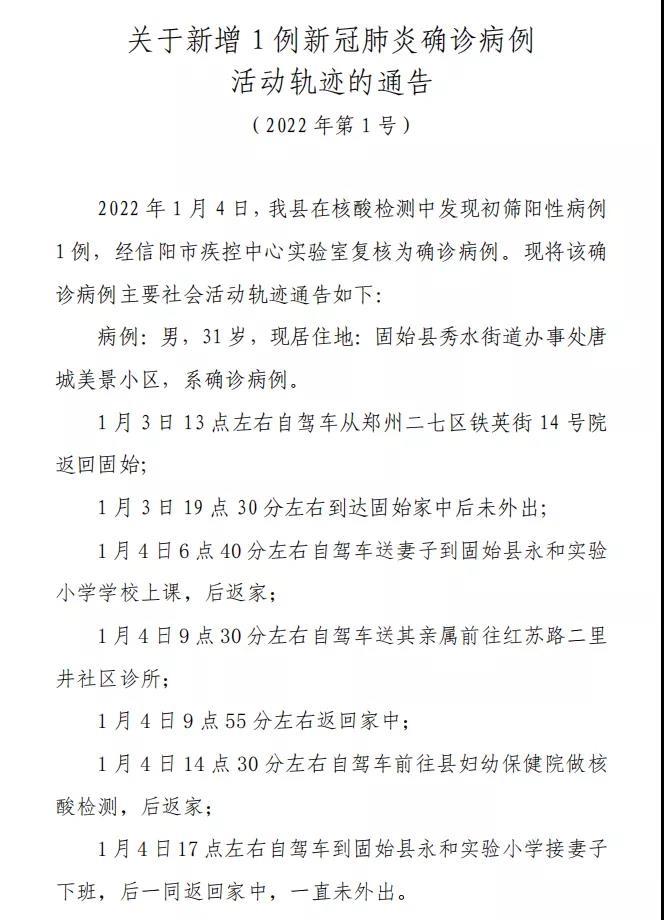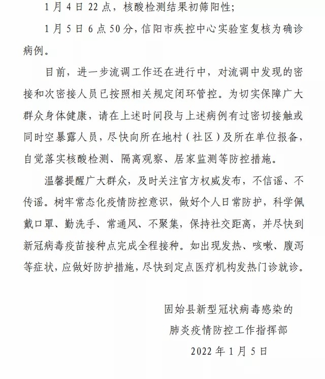 據(jù)固始縣委宣傳部微信公眾號消息,1月4日,河南固始縣在核酸檢測中發(fā)現(xiàn)初篩陽性病例1例,經(jīng)信陽市疾控中心實(shí)驗(yàn)室復(fù)核為確診病例。