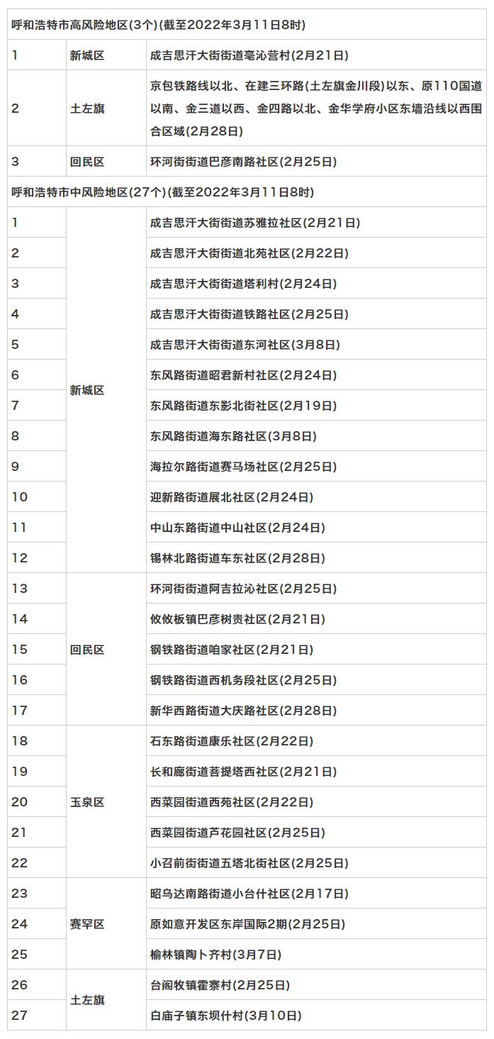 調(diào)整后,呼和浩特市共有高風(fēng)險(xiǎn)地區(qū)3個(gè),中風(fēng)險(xiǎn)地區(qū)27個(gè)。