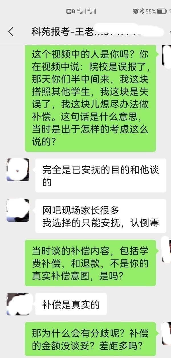 據(jù)樊女士介紹,負(fù)責(zé)給小安報志愿的是科苑報考的王金寶老師,也是內(nèi)蒙古科苑信息科技有限公司的股東之一。樊女士提供的視頻顯示,這名老師在網(wǎng)報志愿現(xiàn)場回復(fù)樊女士:“院校就是誤報了,因為那天你們是半中間來,還有其他學(xué)生,搭照學(xué)生,我這塊兒就失誤了,我這塊兒想盡辦法做補(bǔ)償。”然而,樊女士反映,那天以后,這名老師開始反口,不承認(rèn)誤報,也不愿意按照當(dāng)天商定的補(bǔ)償方案執(zhí)行。