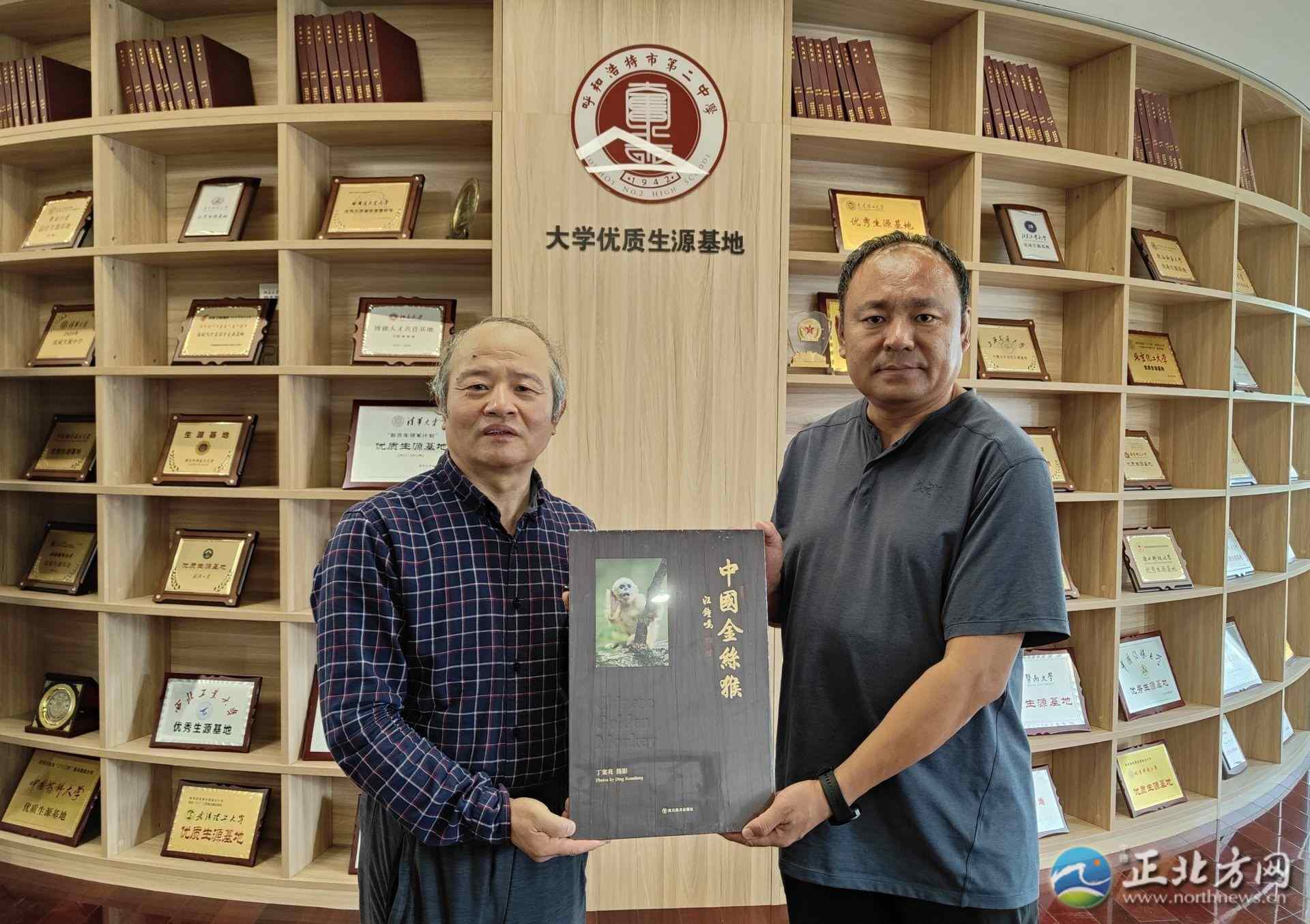 丁寬亮(左)將《中國金絲猴》捐贈呼和浩特市第二中學(xué)
