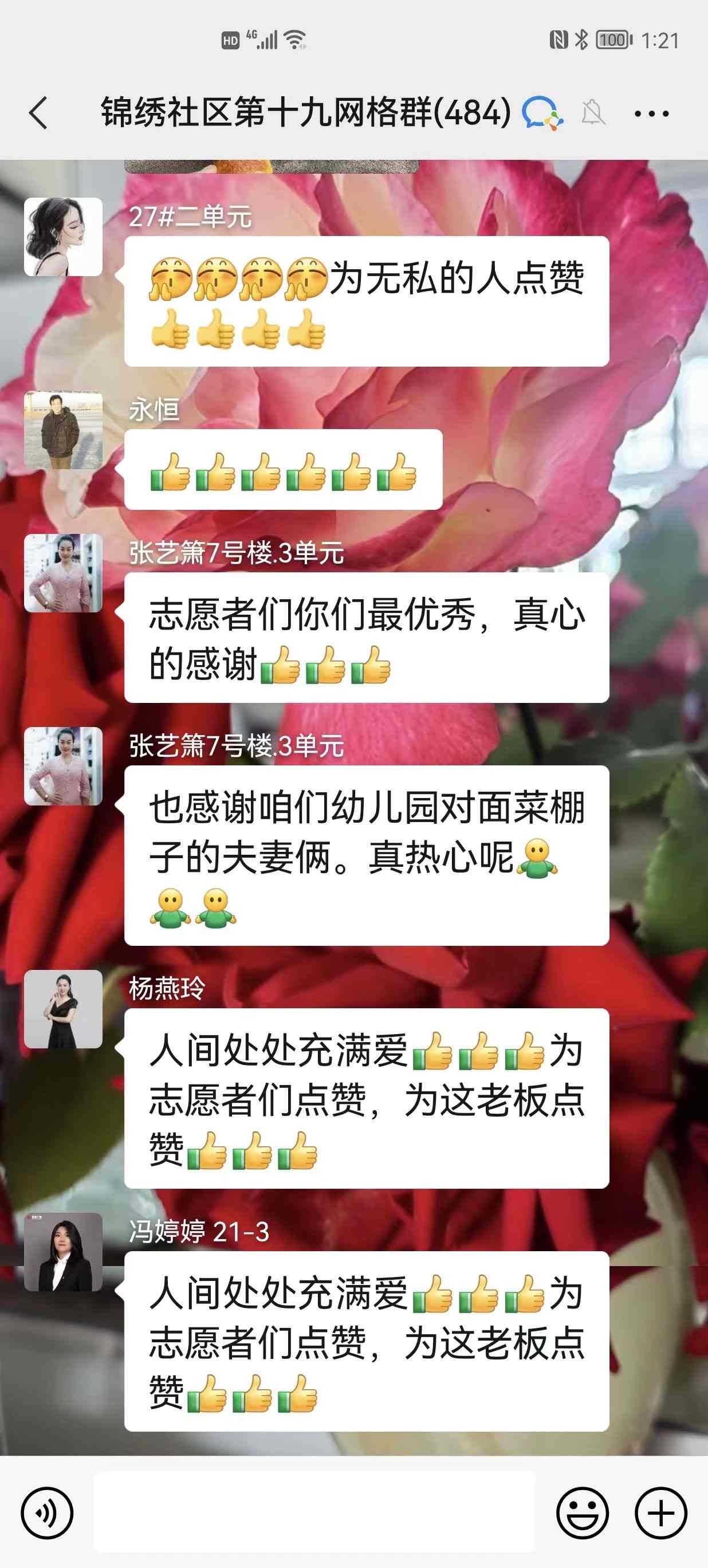 “10元、20元、30元、50元、100元……”10月28日晚,在錦繡社區(qū)第十九網(wǎng)格群,業(yè)主的捐款紛至沓來,短短4個(gè)小時(shí)籌款近萬元。原來,由于景觀花園小區(qū)物業(yè)原有的消殺工作人員肌肉拉傷,消殺速度遠(yuǎn)遠(yuǎn)達(dá)不到預(yù)期,業(yè)主楊博鵬便在群里發(fā)出組建一支消殺志愿者團(tuán)隊(duì)的倡議,號(hào)召業(yè)主們捐款購買專業(yè)消殺彌霧機(jī)和藥品。沒想到倡議得到了廣大業(yè)主的一致響應(yīng),“我報(bào)名!”“我也報(bào)名,躺著也是躺著,不如干點(diǎn)有意義的事!”網(wǎng)格群里沸騰起來,大家紛紛解囊相助,張富、斯琴吐、薛國清、崔占、史永生等15位業(yè)主還踴躍報(bào)名參加消殺志愿者團(tuán)隊(duì)。