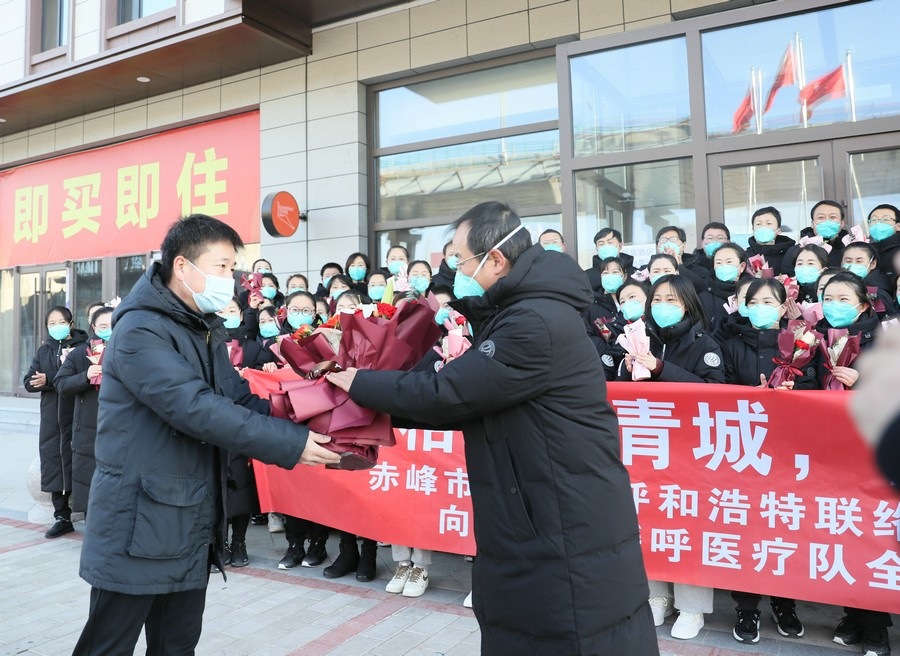 新華融媒、北疆新聞網(wǎng)消息(記者 張楊)“自呼和浩特疫情發(fā)生以來,50多個晝夜,白衣天使們逆行參戰(zhàn),奮戰(zhàn)在抗疫第一線,為呼和浩特保衛(wèi)戰(zhàn)貢獻了自己的力量,體現(xiàn)了白衣天使的責(zé)任和擔(dān)當(dāng),更展現(xiàn)了赤峰人奮勇拼搏的精神,圓滿完成了援呼醫(yī)療各項任務(wù),沒有辜負家鄉(xiāng)人民的重托,大家辛苦啦!”12月5日,在赤峰援呼普通病區(qū)醫(yī)療隊圓滿完成各項任務(wù),即將凱旋之際,赤峰市人民政府駐呼和浩特聯(lián)絡(luò)處和內(nèi)蒙古赤峰商會,共同到醫(yī)療隊駐地看望醫(yī)療隊員。赤峰市人民政府駐呼和浩特聯(lián)絡(luò)處副主任李子輝,代表駐呼聯(lián)絡(luò)處和內(nèi)蒙古赤峰商會在呼和浩特地區(qū)鄉(xiāng)友,向援呼醫(yī)療隊領(lǐng)隊羅俊祥等醫(yī)護人員獻上鮮花和對家鄉(xiāng)同胞的親切問候。