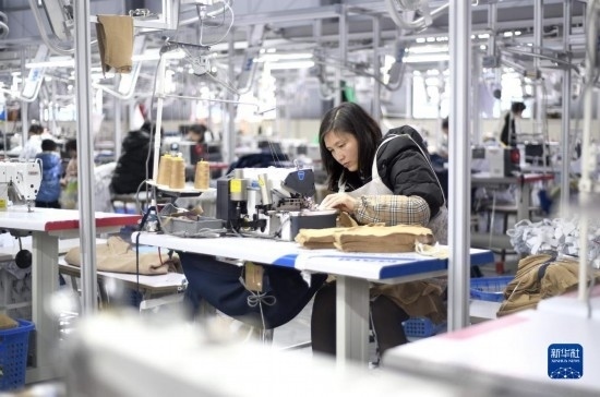 2月15日,工人在貴州省黔西南布依族苗族自治州安龍縣一家服裝企業(yè)生產車間加工服裝產品。