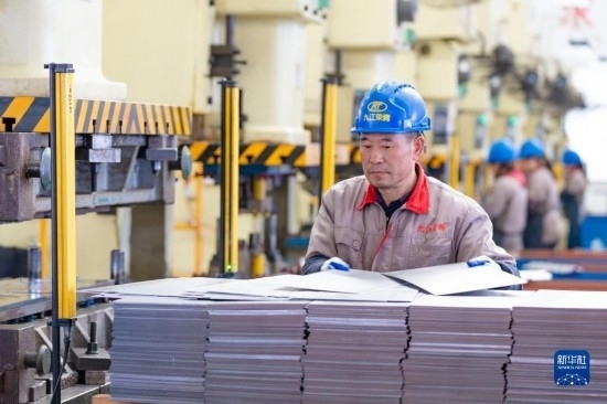 2月15日,在山東省濱州市博興縣店子鎮(zhèn)一家廚具生產企業(yè)車間內,工人在生產線上加工廚具。