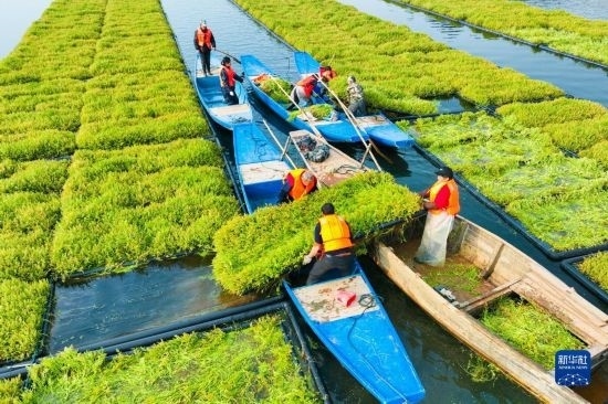 近年來,浙江省杭州市淳安縣在千島湖典型庫灣、入湖口等區(qū)域,積極運(yùn)用生態(tài)浮島水上植物無土栽培技術(shù)種植空心菜、水芹菜等水生蔬菜,直接吸收庫區(qū)水體中氮磷等元素,從而能夠有效地降低水體中營養(yǎng)物質(zhì)的含量,提升水質(zhì)。近日,水生蔬菜進(jìn)入采收季節(jié),“湖上菜園”呈現(xiàn)春收繁忙景象。