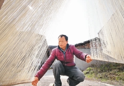 2月16日,江西省撫州市金溪縣滸灣鎮(zhèn)老街區(qū),油面師傅在晾曬老字號食品滸灣油面。 鄧興東攝(人民視覺)