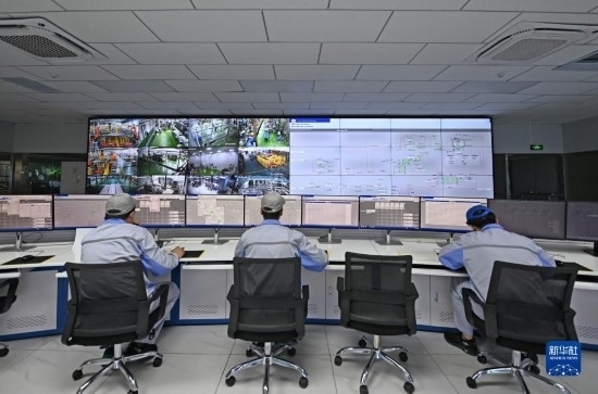 在天津海河乳品有限公司智能化生產(chǎn)線控制中心內(nèi),工作人員在監(jiān)控生產(chǎn)線運(yùn)轉(zhuǎn)情況(2月20日攝)。