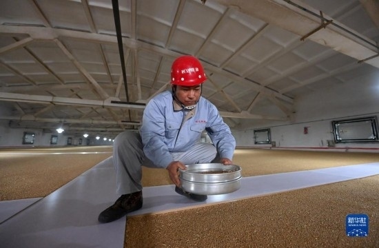 在天津利達(dá)糧油有限公司原糧倉,工作人員查看糧食儲藏情況(2月23日攝)。