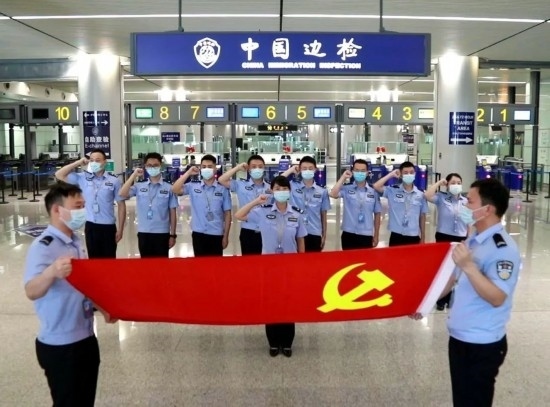 圖為孫偉帶領執(zhí)勤隊黨員移民管理警察開展重溫入黨誓詞活動。