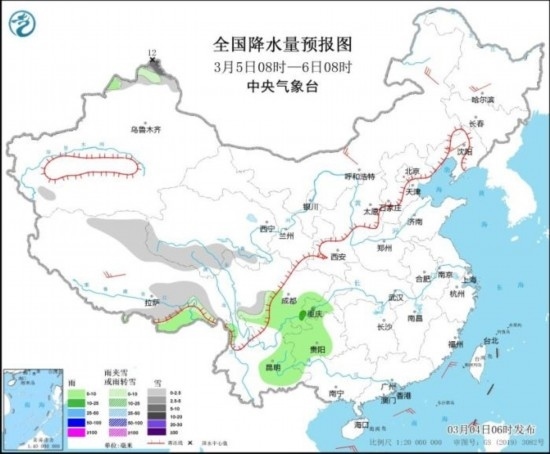 全國降水量預(yù)報(bào)圖(3月5日08時(shí)-6日08時(shí))
