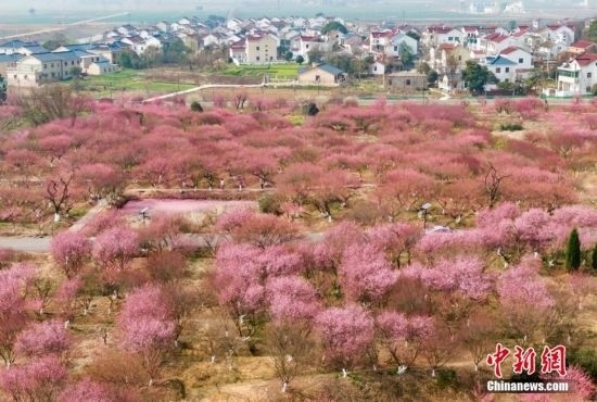 3月9日,江蘇南京,郊外盛開的梅花接連成片,呈現(xiàn)“粉色海洋”。中新社記者 泱波 攝