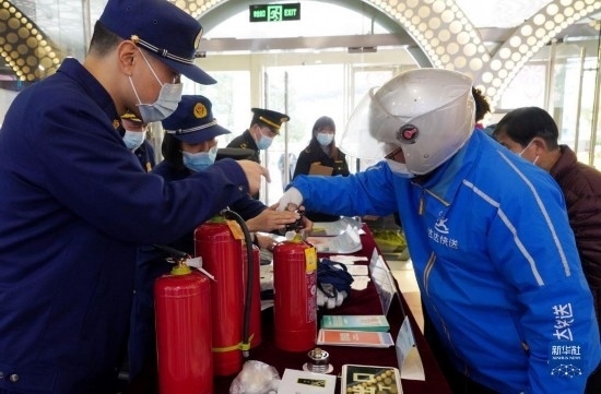 3月14日,一名快遞員(右)在宣傳攤位前體驗(yàn)滅火器的使用方法。