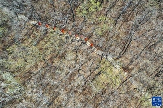 3月15日,長清區(qū)國有蓮臺山林場防火中隊隊員在林區(qū)巡護(hù)(無人機(jī)照片)。