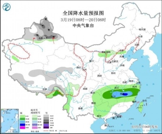 3月19日08時至20日08時,新疆北疆大部和沿天山地區(qū)、西藏北部和南部、青海南部等地部分地區(qū)有小到中雪或雨夾雪,其中,新疆沿天山地區(qū)和東部等地部分地區(qū)有大到暴雪(10~11毫米)。西藏東南部、湖南中北部、江西中北部、浙江南部、福建北部等地部分地區(qū)有中到大雨,其中,江西中部、福建西北部等地局地有暴雨。新疆南疆盆地和東部等地部分地區(qū)有7~9級風。