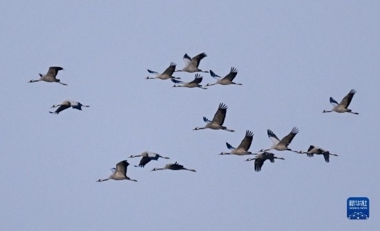 3月20日,在內(nèi)蒙古自治區(qū)呼和浩特市托克托縣黃河沿岸,黑頸鶴在空中飛翔。