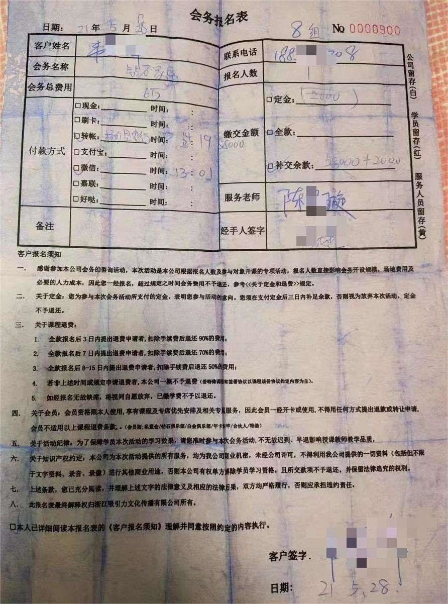楊濤鳴的另一個(gè)弟子富麗有類似經(jīng)歷。2020年,繳納14萬元后意識(shí)到“可能陷入騙局”,她找到吸引公司要求退款,拖延至今。