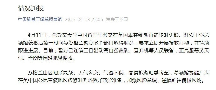 ·一名中國(guó)留學(xué)生在英國(guó)徒步時(shí)失聯(lián),中領(lǐng)館:已聯(lián)系警方,正抓緊搜救。