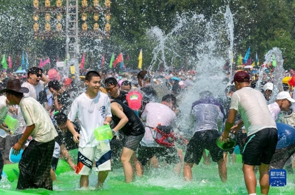 云南省德宏傣族景頗族自治州芒市2023年潑水狂歡節(jié)開幕,人們相互潑灑代表幸福、吉祥的清水,表達(dá)著相互間的無限祝福。