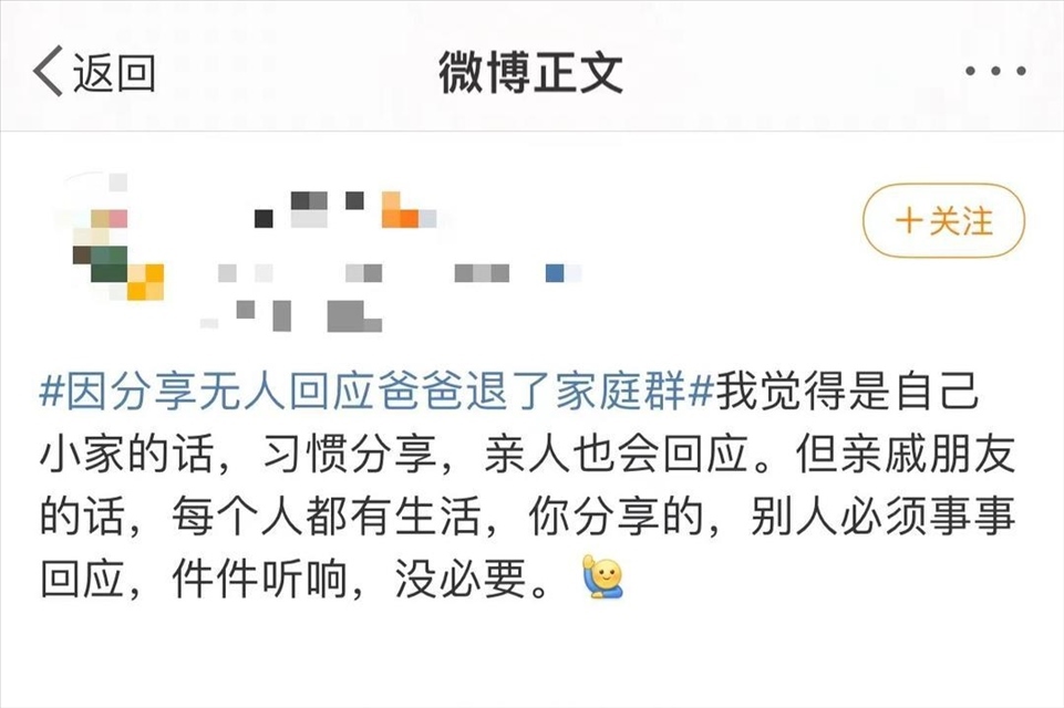 這則微博引起了許多網(wǎng)友的情感共鳴,不少網(wǎng)友表示有著類似的情況和經(jīng)歷。“分享鏈接沒回應(yīng)就算了,認(rèn)真分享生活卻一直都沒有回應(yīng)的話,想退群也是正常的。”一名網(wǎng)友說。