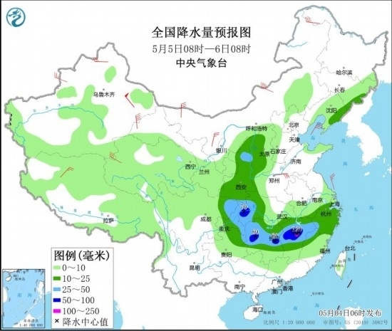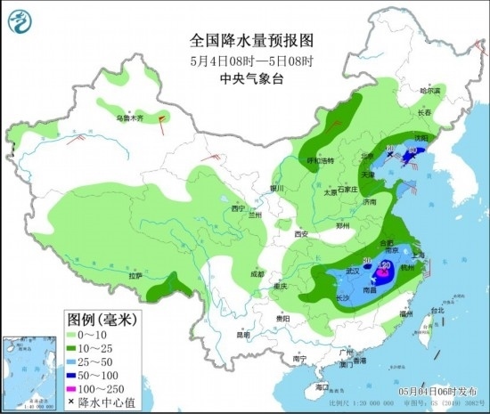 5月4日08時至5日08時,湖北南部和東部、安徽南部、湖南東北部、江西中北部、浙江西部、江蘇南部以及山東半島、遼寧南部、河北東部等地部分地區(qū)有大到暴雨,其中,安徽南部、江西北部等地部分地區(qū)有大暴雨(100~120毫米)。上述部分地區(qū)伴有短時強(qiáng)降水(最大小時降雨量20~40毫米,局地可超過50毫米),局地有雷暴大風(fēng)等強(qiáng)對流天氣。內(nèi)蒙古中部、黑龍江東北部、新疆南疆盆地、甘肅河西、山東半島等地部分地區(qū)有4~6級風(fēng),其中,新疆東部部分地區(qū)有8~9級風(fēng)。渤海、渤海海峽、黃海大部、東海北部海域?qū)⒂?~8級、陣風(fēng)9~10級的大風(fēng)。