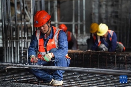 5月3日,在長沙西站建設(shè)工地,工人做混凝土澆筑前準(zhǔn)備。