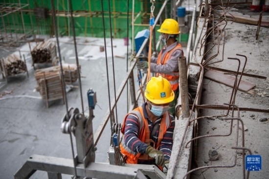 5月3日,工人在湖南長沙智谷項(xiàng)目建設(shè)工地為一棟高層建筑安裝幕墻。