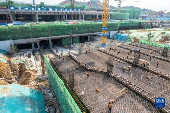 5月3日,中建三局的工人在海南中心項(xiàng)目的“空中造樓機(jī)”內(nèi)施工。