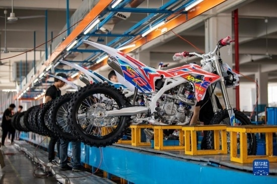5月4日,在浙江省金華市武義縣桐琴鎮(zhèn)五金工業(yè)區(qū)的一家企業(yè),工人趕制準(zhǔn)備銷往海外的越野摩托車。