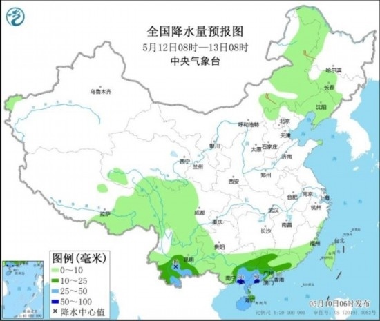 5月12日08時(shí)至13日08時(shí),西藏東部、青海南部等地部分地區(qū)有小到中雪或雨夾雪;云南中南部、廣西東南部、廣東中西部和海南島等地部分地區(qū)有中到大雨,其中,廣西東南部沿海、廣東西南部等地局地有暴雨(50~90毫米)。內(nèi)蒙古中東部、東北地區(qū)中西部等地部分地區(qū)有4~5級風(fēng)。