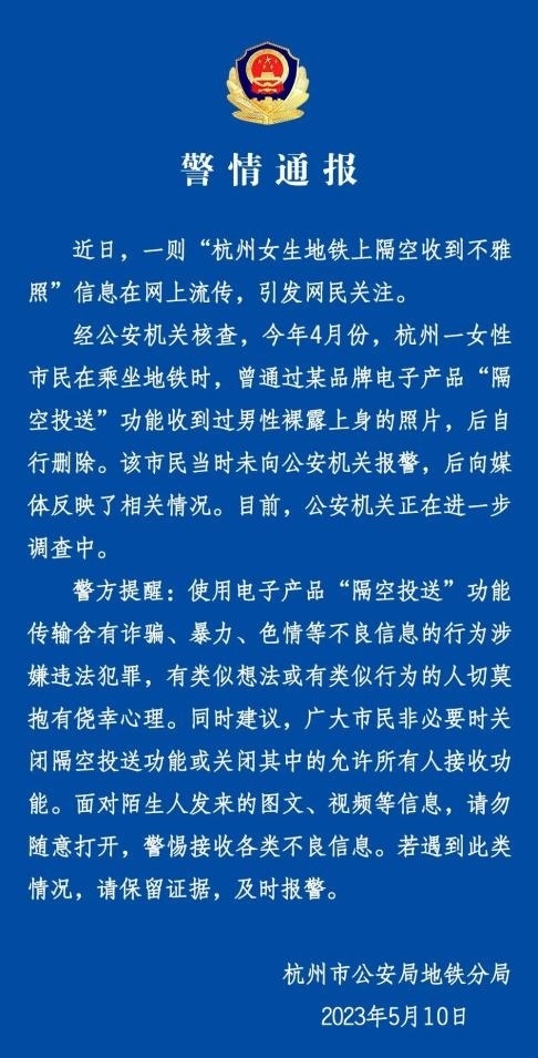 ·杭州一女子地鐵上隔空收到不雅照,警方回應(yīng):正在進(jìn)一步調(diào)查。