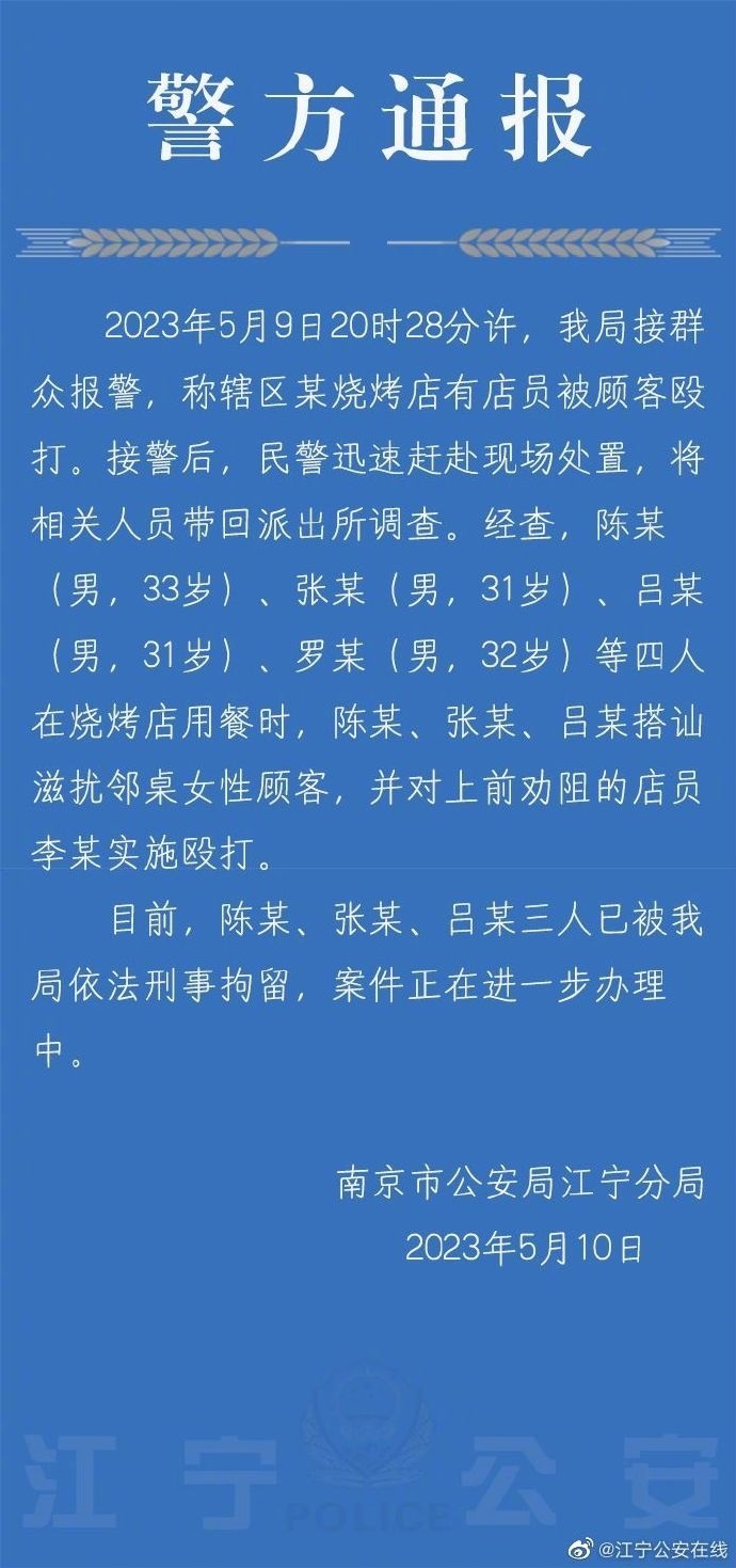 ·南京警方:三男子搭訕滋擾鄰桌女顧客并毆打勸阻店員,已刑拘。