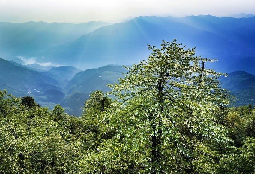 時下,正是珙桐花開的季節(jié),一朵朵珙桐花如白鴿舒展雙翅,在林中翩翩起舞,為美麗的大風(fēng)頂增添了一絲靈動。