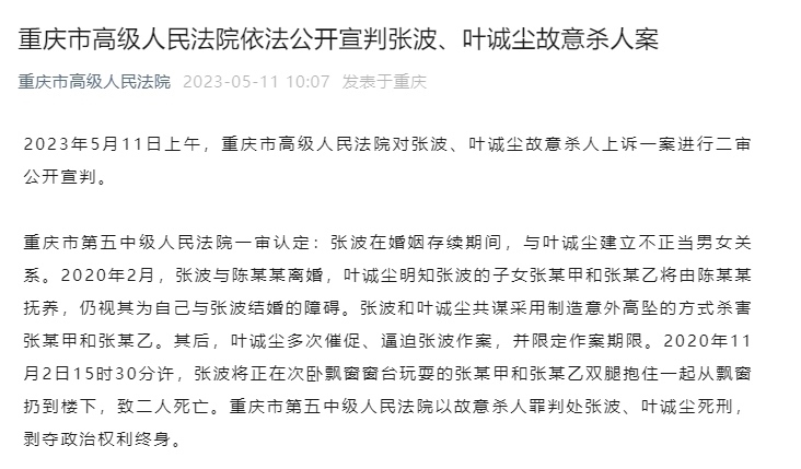·重慶市高級(jí)人民法院裁定張波、葉誠(chéng)塵故意殺人案駁回上訴,維持原判。