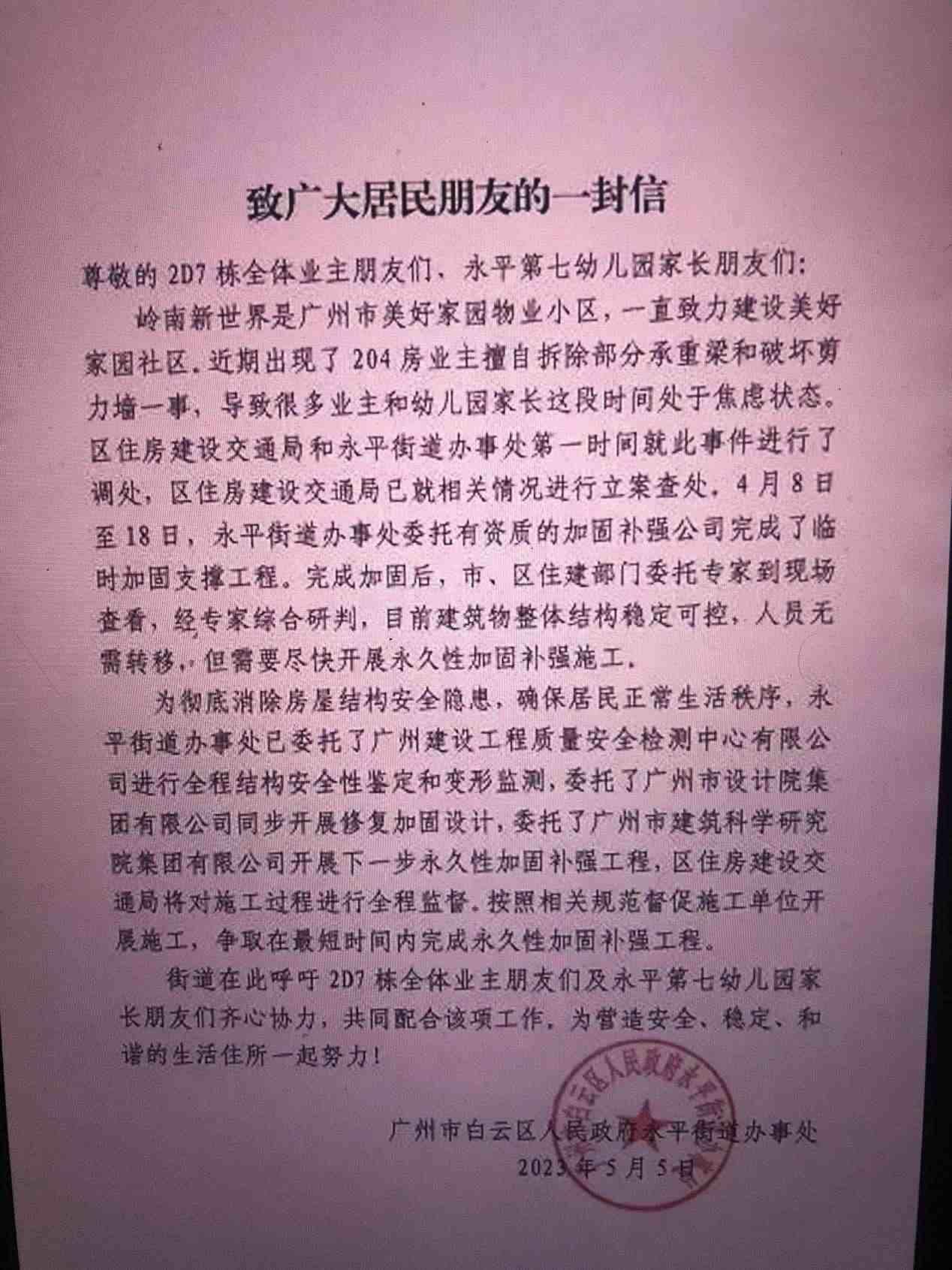 ·“廣州一租戶私拆承重墻”追蹤:已臨時(shí)加固,業(yè)主擬聯(lián)合起訴。