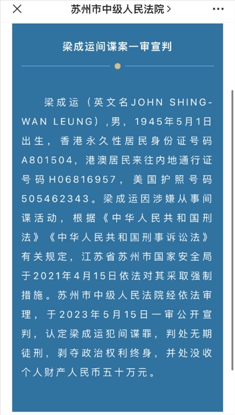 ·梁成運(yùn)犯間諜罪一審被判無(wú)期徒刑。