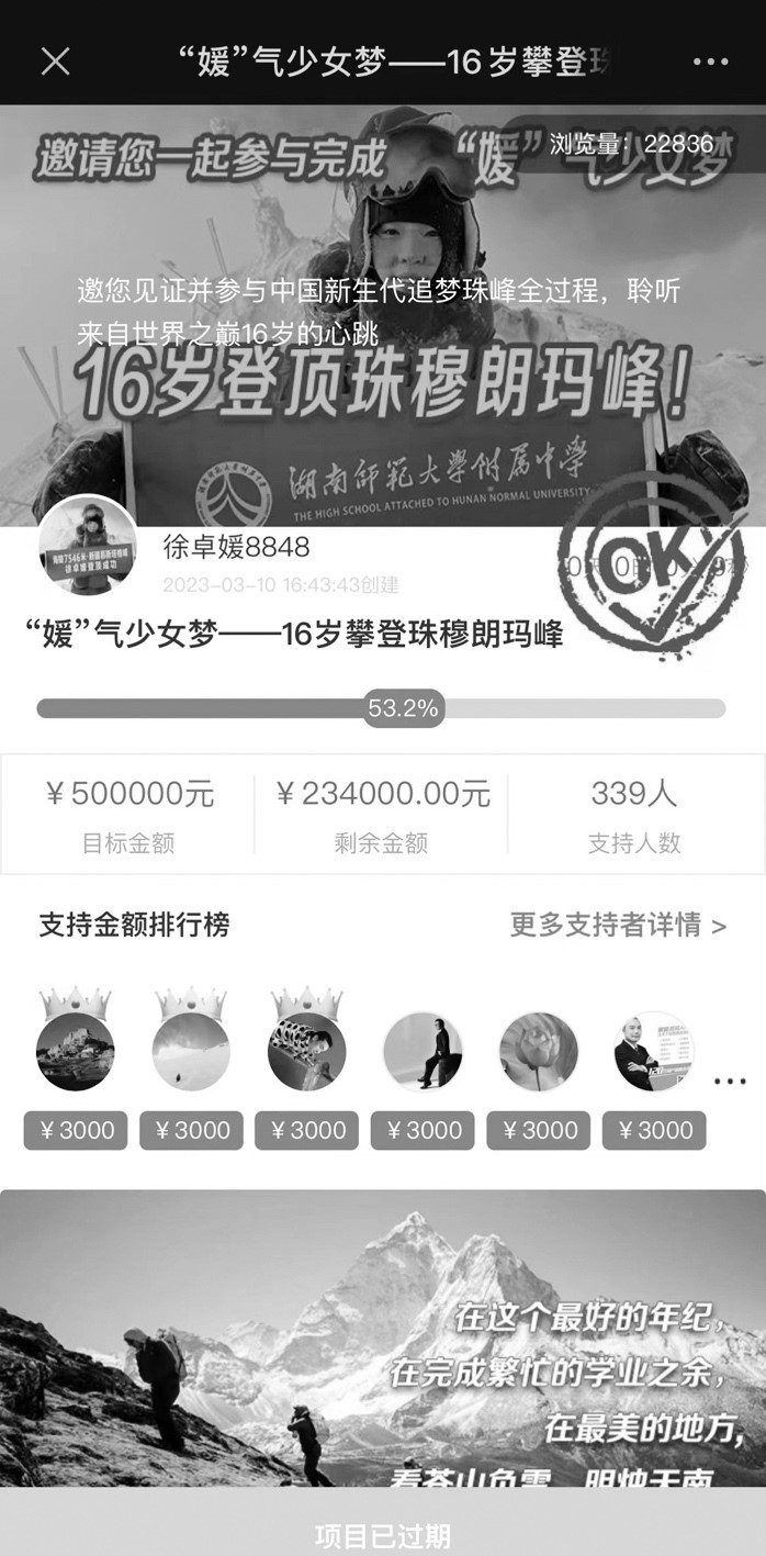 5月15日,揚(yáng)子晚報紫牛新聞記者再次點開徐卓媛當(dāng)初發(fā)起助力登峰的眾籌鏈接,發(fā)現(xiàn)該項目已過期,籌款進(jìn)度最終定格在53.2%,最終籌集到資金266000元。除去徐江雷朋友們贊助的這二十多萬元,據(jù)了解,還有一些企業(yè)也出資贊助了徐卓媛登頂珠峰的活動。徐江雷此前告訴記者,江蘇一家藥企看到此前揚(yáng)子晚報對于徐卓媛的報道后(本報今年3月17日刊登《眾籌50萬,助16歲女兒挑戰(zhàn)珠峰》一文),被她小小年紀(jì)敢于攀登高峰的精神所打動,秉承著“少年強(qiáng)則國強(qiáng)”的理念,慷慨贊助徐卓媛登山資金30萬元。
