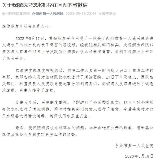 ·永州第一人民醫(yī)院致歉病房飲水機長青苔:追責相關部門負責人。