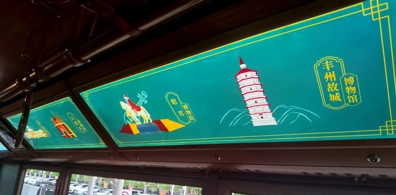 除了復(fù)古風(fēng)的車身外型,主題車廂內(nèi)也充滿了如詩(shī)如畫(huà)的文旅元素,為乘客們顯示了五塔寺、昭君博物院、豐州故城博物館等本土旅游勝地,乘坐鐺鐺車,乘客在瀏覽美麗街景的同時(shí),也可通過(guò)車內(nèi)看板了解到青城的名勝古跡。