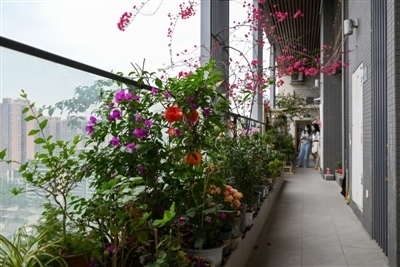 ■ 在這面美麗的花墻背后,是小區(qū)開發(fā)商和樓棟240戶人家,共同打造出的花草童話——由開發(fā)商種植的三角梅在交房時一并移交給業(yè)主,業(yè)主在門口的公共空間打造屬于自己的“小花園”。10年時間過去,240戶居民打造出了32層高的三角梅,還有繡球、蝴蝶蘭、多肉等綠植,櫻桃樹、桃樹、葡萄藤等水果植物,花椒、大蒜、番茄、西蘭花等蔬菜。