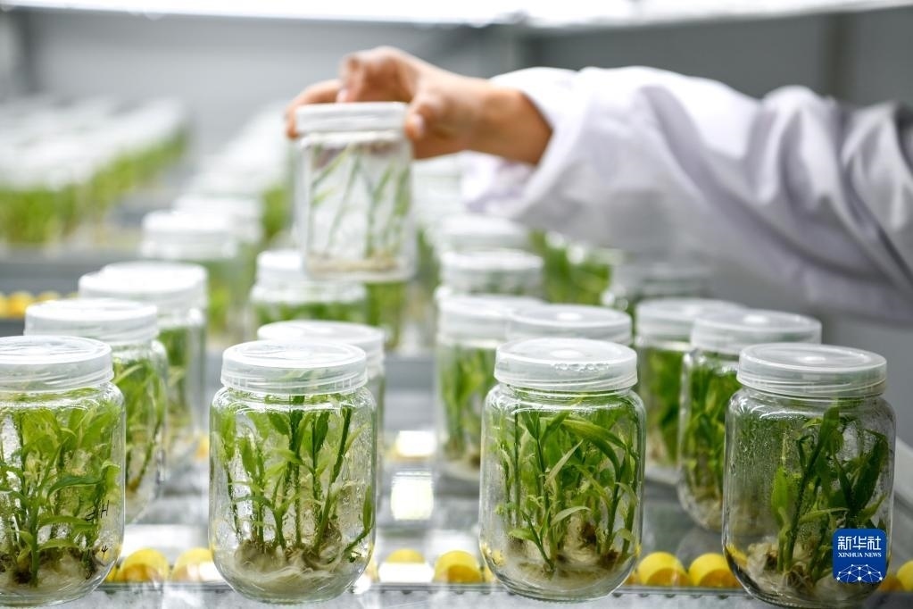5月23日,工作人員在貴陽(yáng)市開(kāi)陽(yáng)縣南江蔬菜良種繁育中心的組培中心查看小黃姜苗生長(zhǎng)情況。